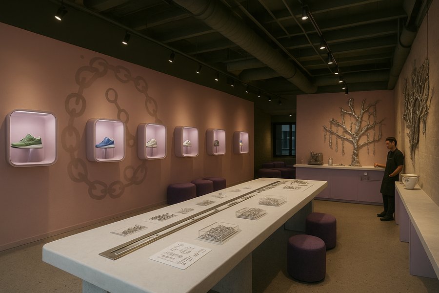 2. Feral store interior: open loft with pastel pink walls and olive ceilings. Central white resin workbench for clipping chains and charms onto sneakers. Display pods with single shoes on lavender pedestals. Feature wall with metallic lattice tree hanging sample accessories. Polished concrete floors, violet ottomans, layered lighting. Wide-angle shot focusing on workbench, high detail on metal and leather textures. Youthful, gallery-like sneaker customization space.