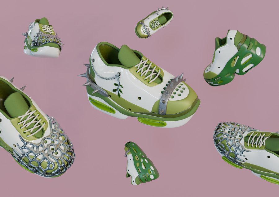 2. Bright green and white Feral sneakers with bulky sculptural soles on a reflective pink background. Glossy rubber, metallic studs, and punk-inspired chains. Futuristic streetwear aesthetic with surreal levitating feel.