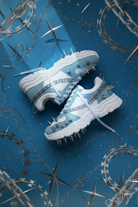 3. A close-up of Feral sneakers in the blue base variation. The chunky sole is smooth white rubber with deep wave-like contours. A star-shaped metal pattern decorates the side panels.